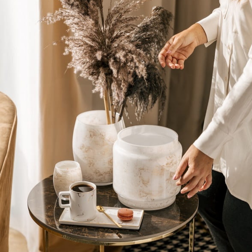 Szklany wazon marki VanderGroff – VG20/White został wykonany z wysokiej jakości szkła i dekorowany ręcznie z niezwykłą precyzją w delikatne bieli ze złotym marmurem, który wnosi do wnętrza blask i elegancję. Jego delikatny wygląd doskonale wpasowuje się w różne style wnętrzarskie, od skandynawskiego po boho. Idealny do wnętrz i przestrzeni zewnętrznych, tworząc ciepły, kojący klimat.