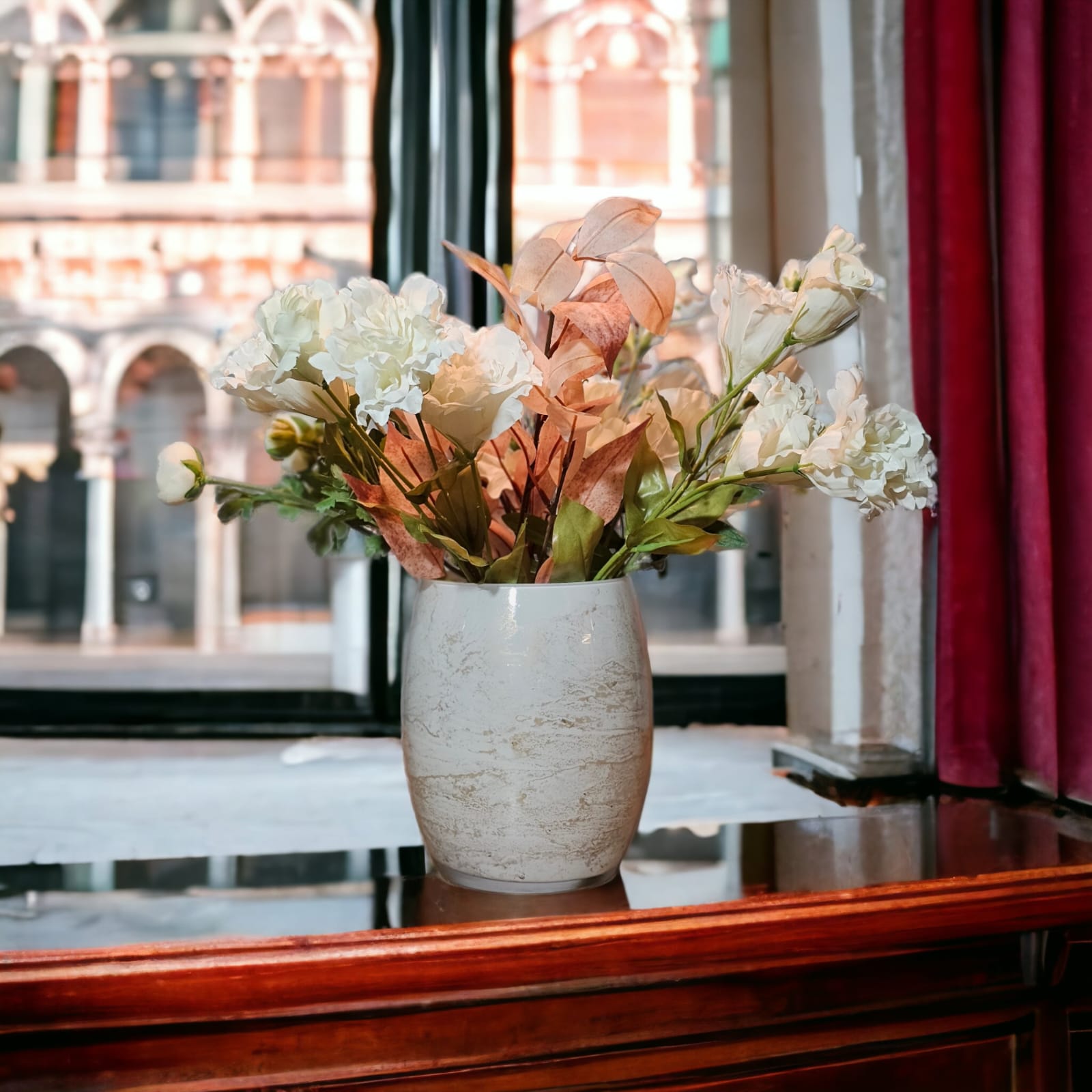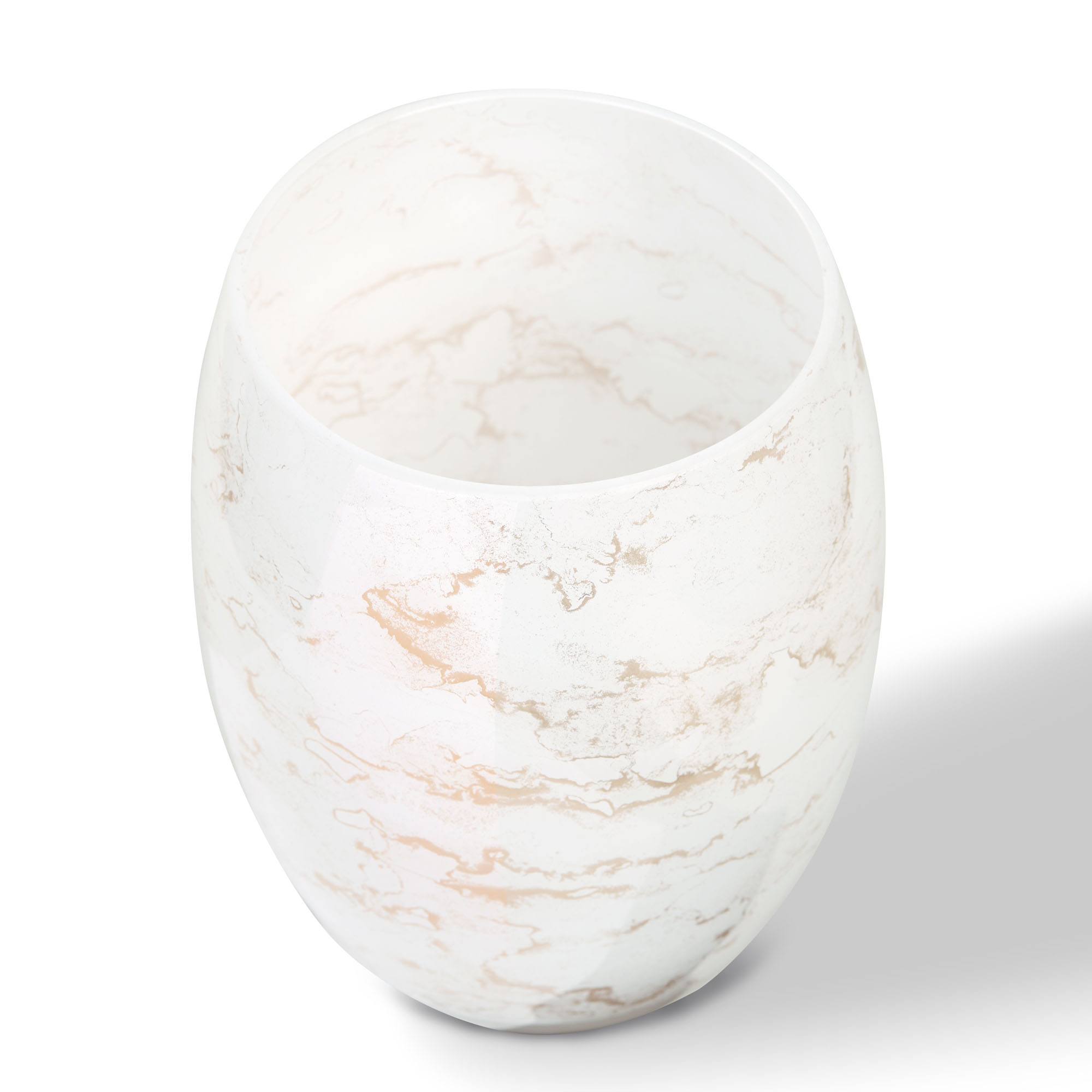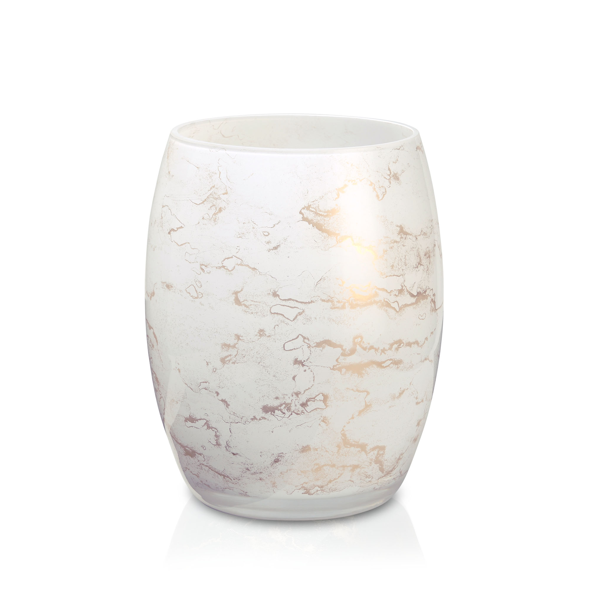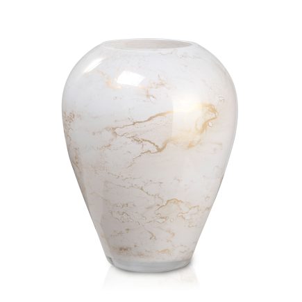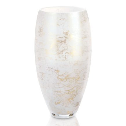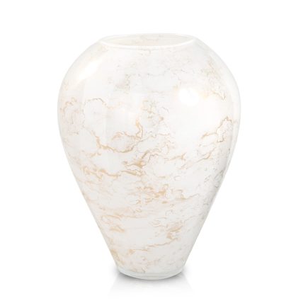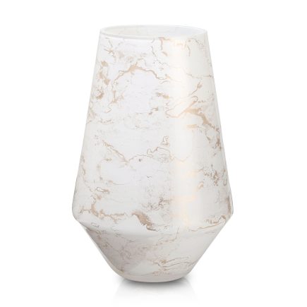 Szklany wazon marki VanderGroff – VG20x16/White został wykonany z wysokiej jakości szkła i dekorowany ręcznie z niezwykłą precyzją w delikatne bieli ze złotym marmurem, który wnosi do wnętrza blask i elegancję. Jego delikatny wygląd doskonale wpasowuje się w różne style wnętrzarskie, od skandynawskiego po boho. Idealny do wnętrz i przestrzeni zewnętrznych, tworząc ciepły, kojący klimat.