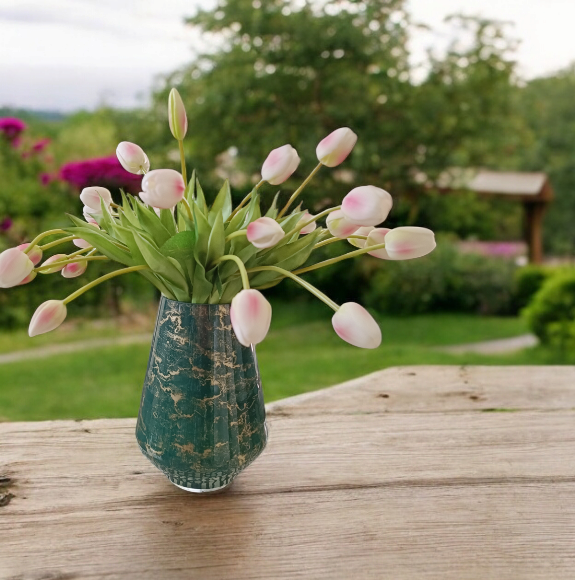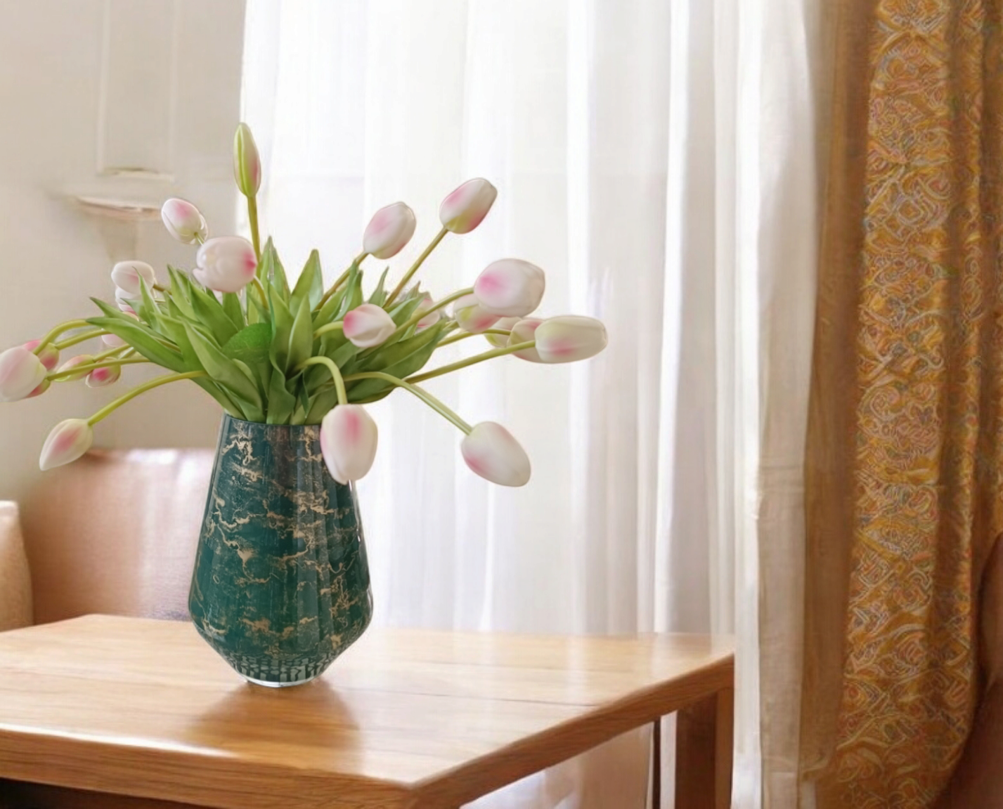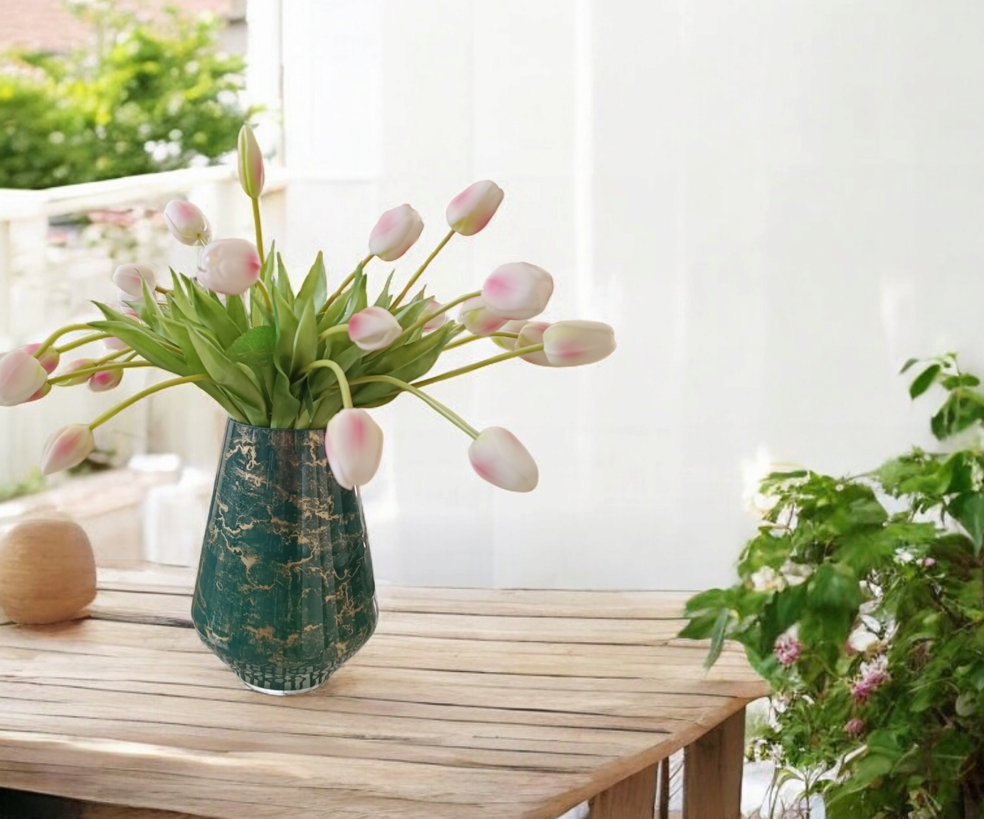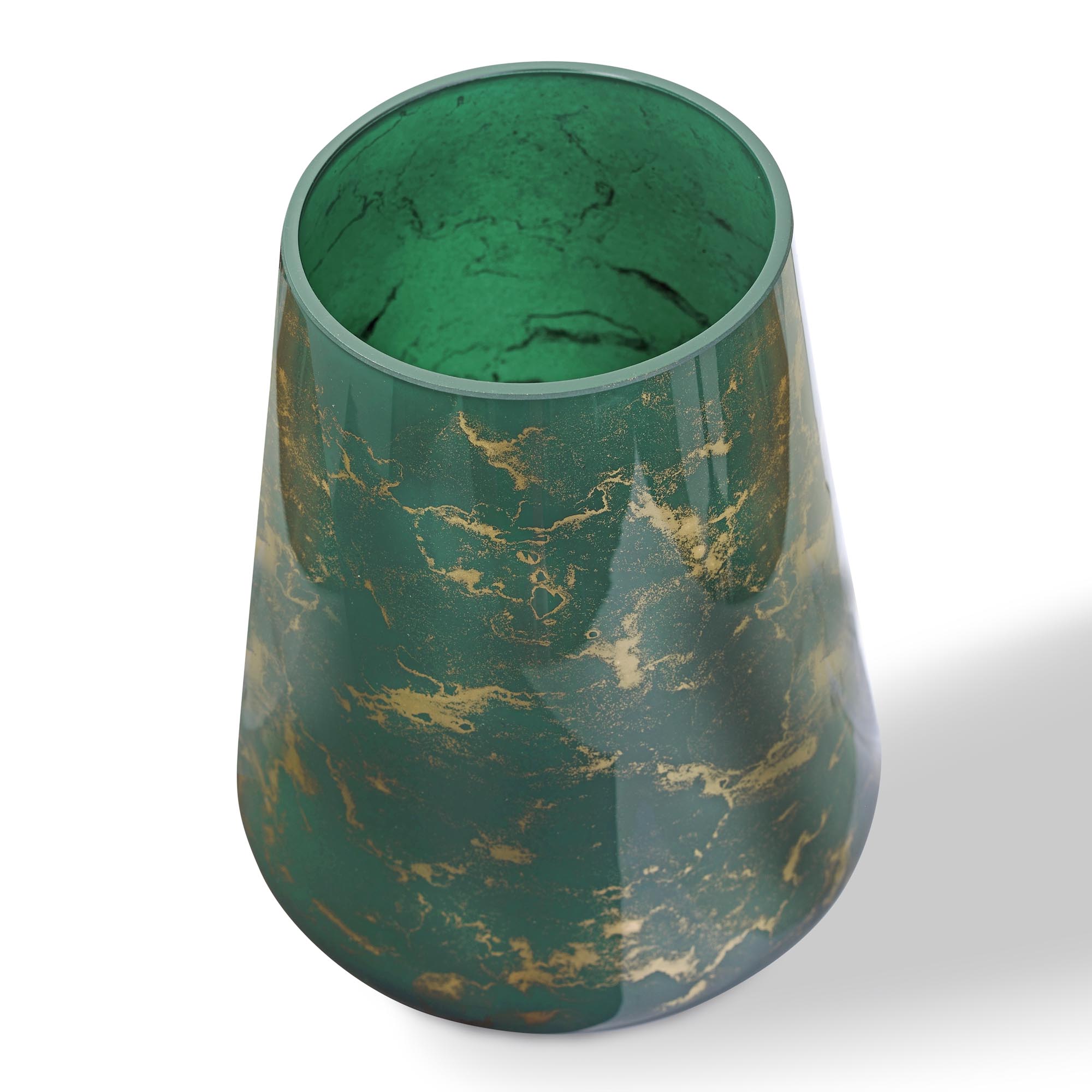Szklany wazon marki VanderGroff – VG27 Diament/Green został wykonany z wysokiej jakości szkła i dekorowany ręcznie z niezwykłą precyzją. Wyjątkowy kolor butelkowej zieleni z dodatkiem złotego marmuru nadaje mu luksusu i elegancji. Ten wazon stanowi dodatek jak do nowoczesnych tak i do tradycyjnych wnętrz.