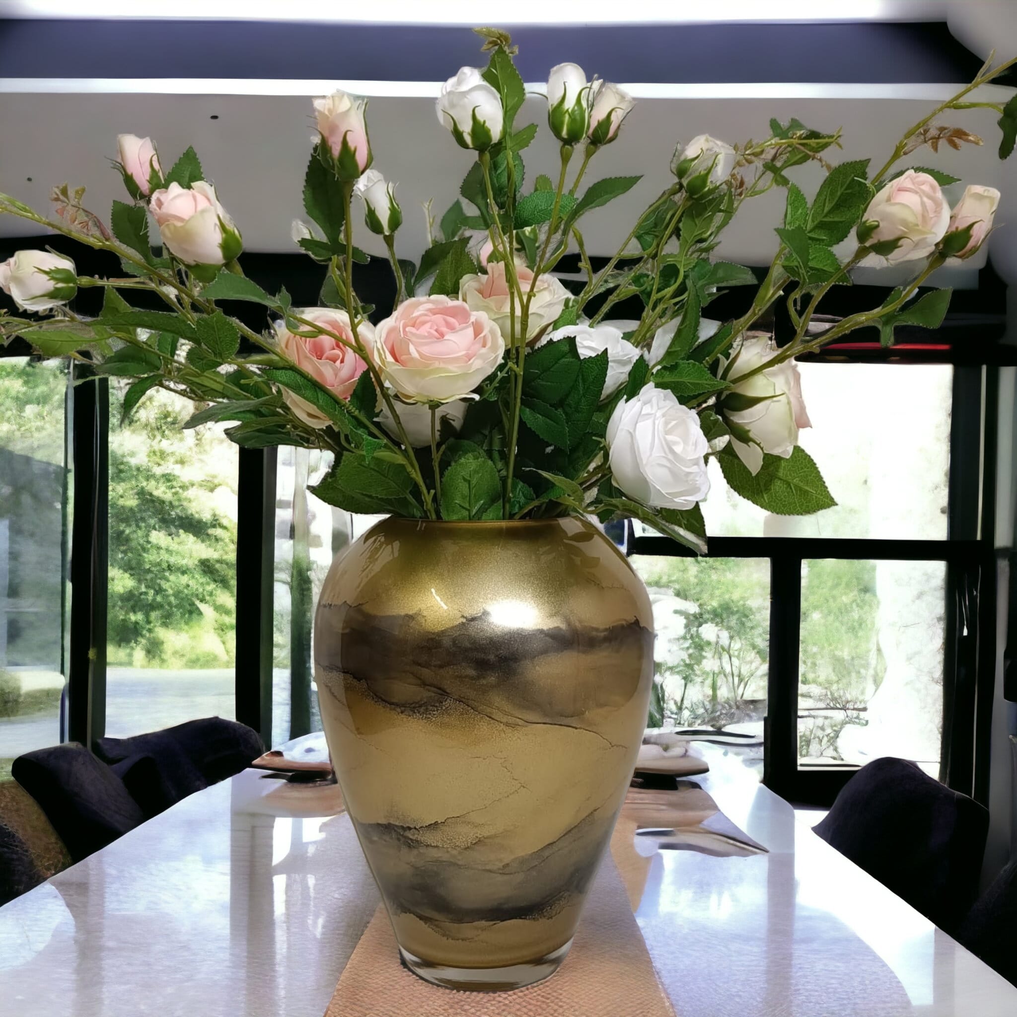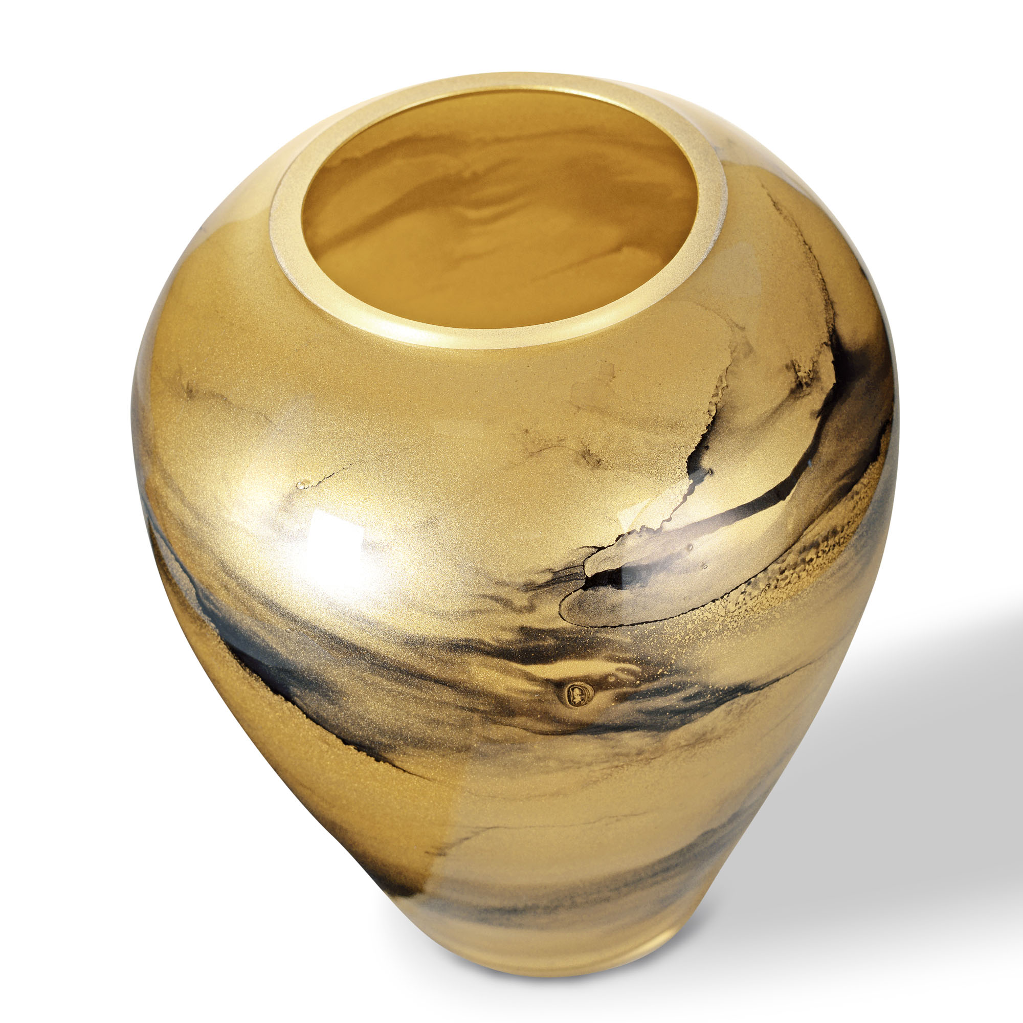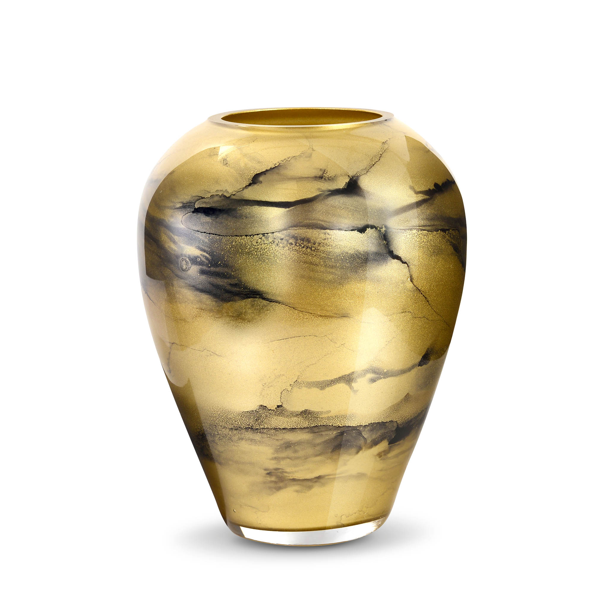 Szklany wazon marki VanderGroff – VG27/GOLD został wykonany z wysokiej jakości szkła i dekorowany ręcznie z niezwykłą precyzją. Złoty kolor w połączeniu z eleganckimi, ciemnymi marmurowymi wzorami nadają mu luksusowy charakter i elegancję. Idealnie sprawdzi się jako stylowy dodatek do wnętrz, wnosząc nutę klasy i prestiżu zarówno w nowoczesnych, jak i tradycyjnych aranżacjach.