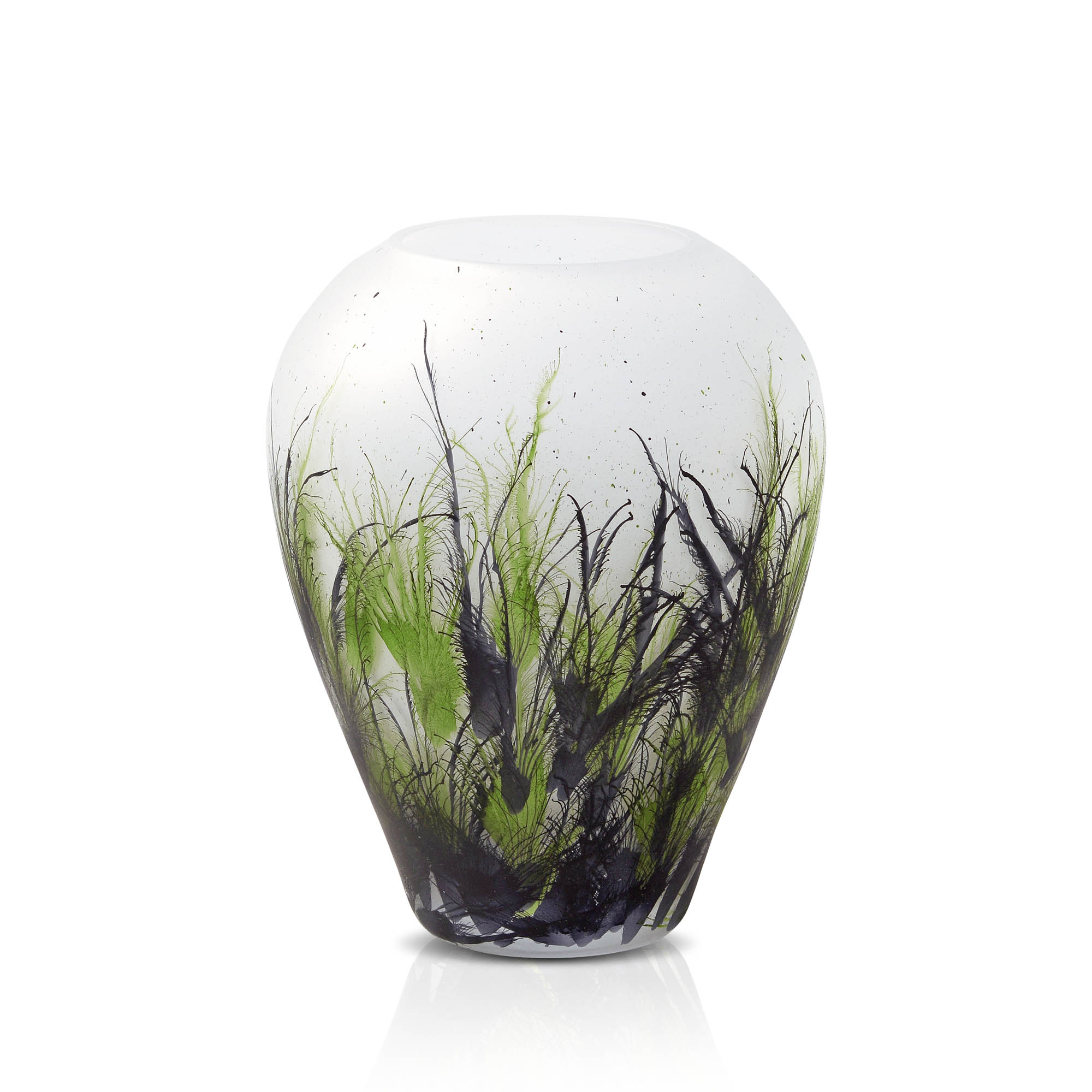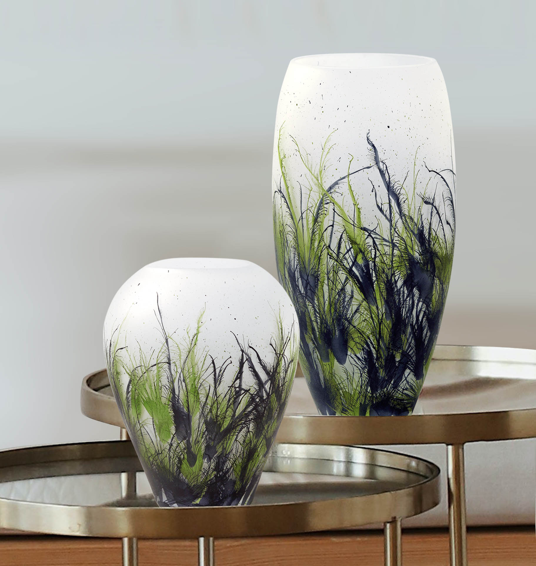 Szklany wazon marki VanderGroff – VG27/Natura został wykonany z wysokiej jakości szkła i zdobiony ręcznie, inspirowany brawami natury. Jego wyjątkowo zielono-czarne zdobienie w połączeniu z jedwabistym matowym kolorem tworzy niezwykle efektowną kompozycję, która przyciąga wzrok i stanowi elegancki akcent w każdym pomieszczeniu.