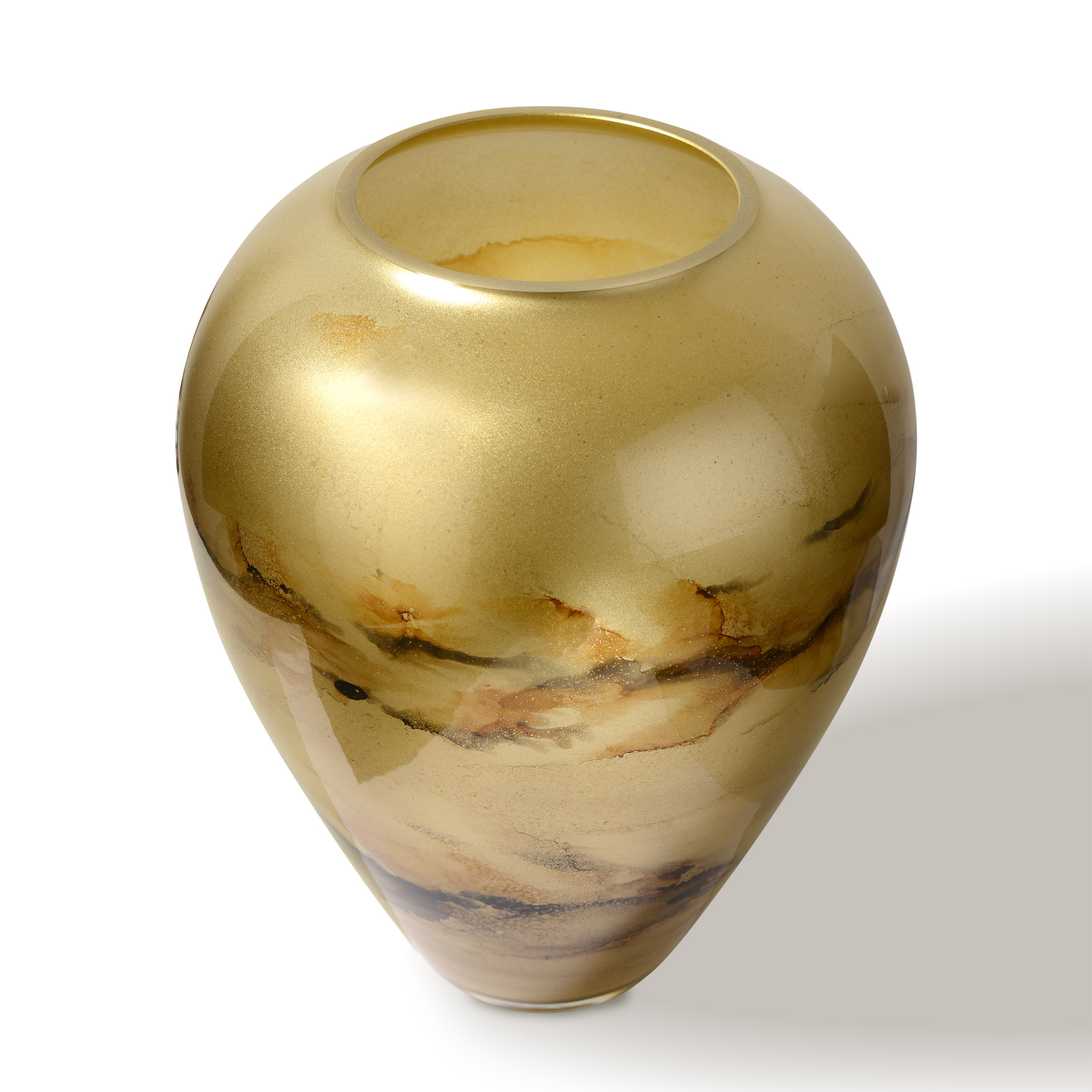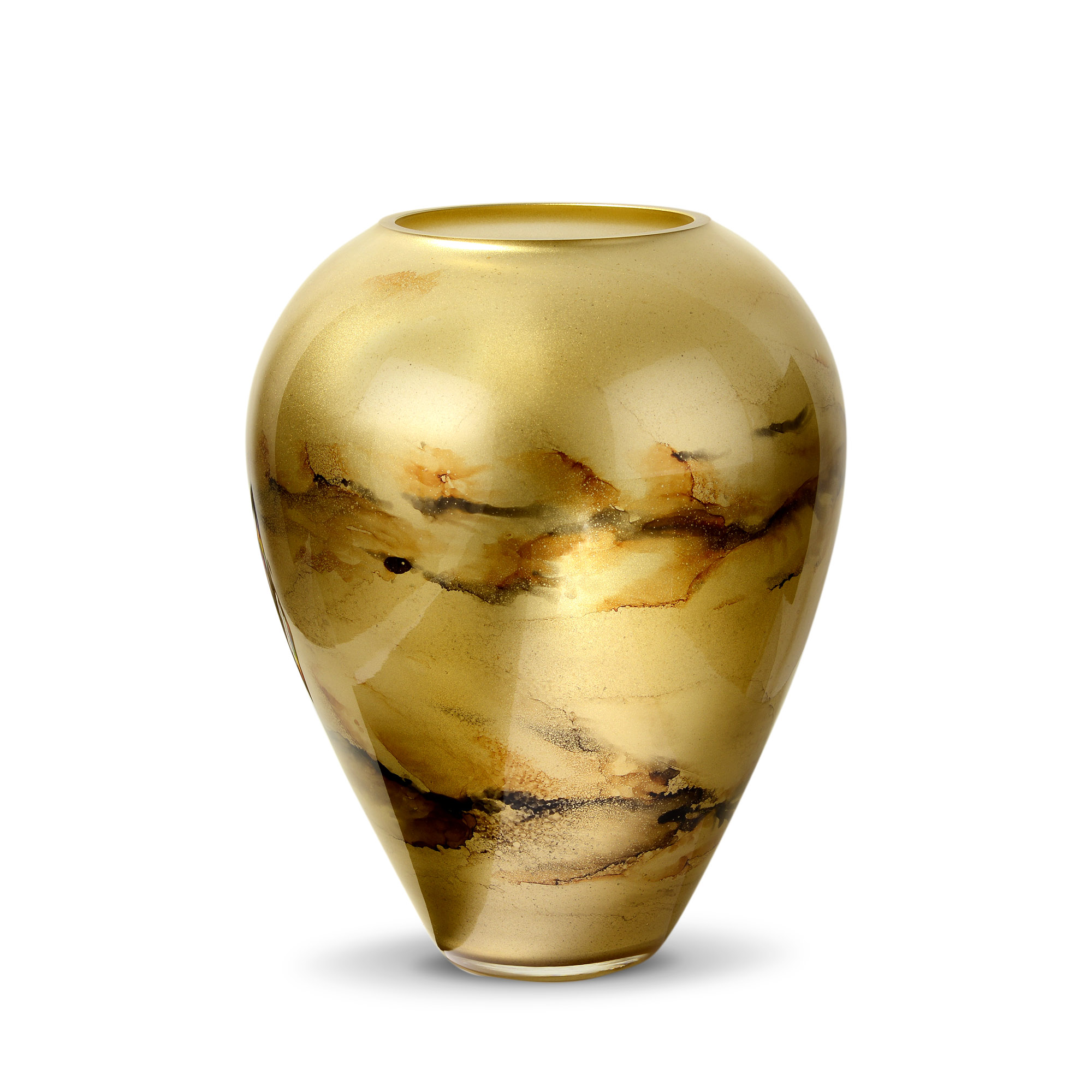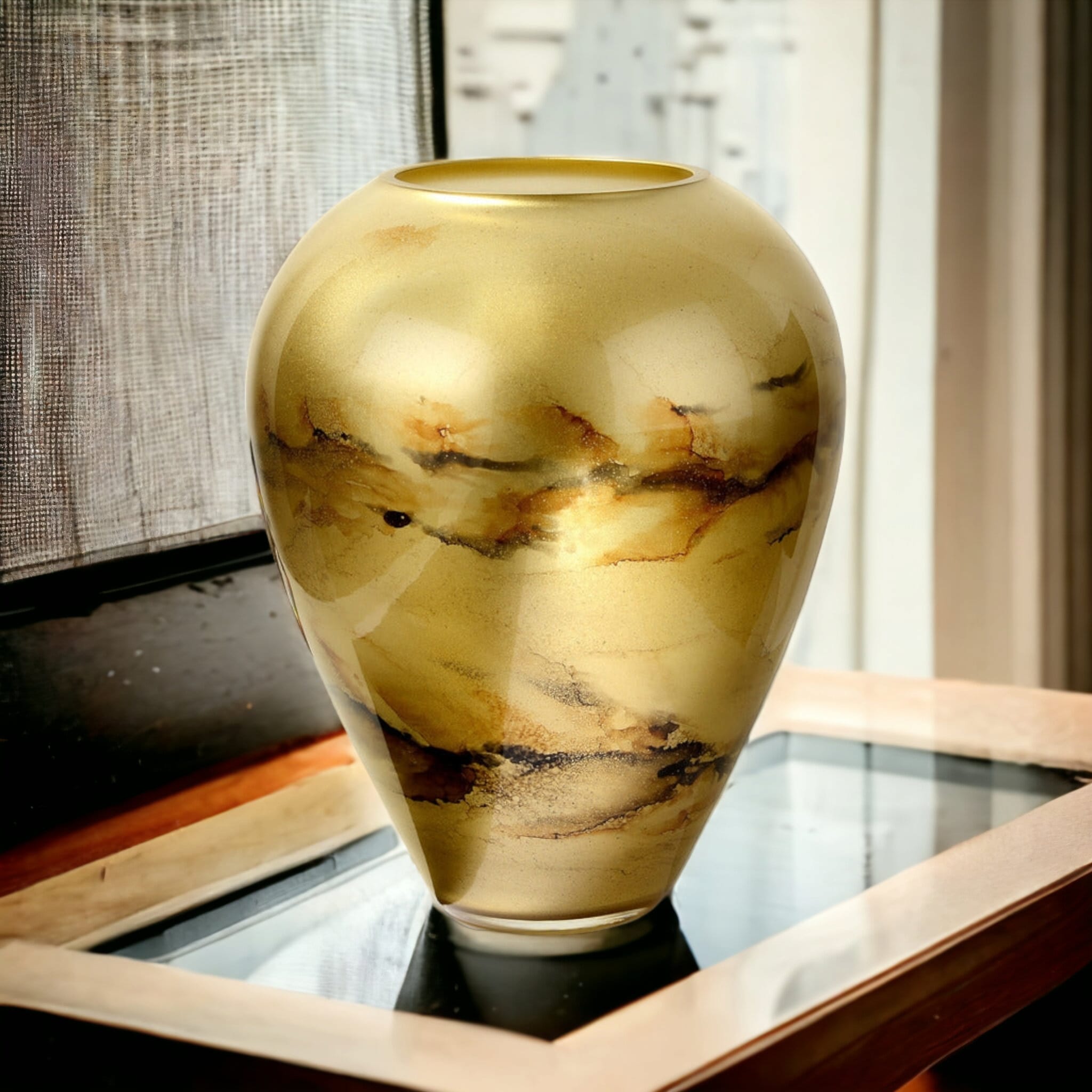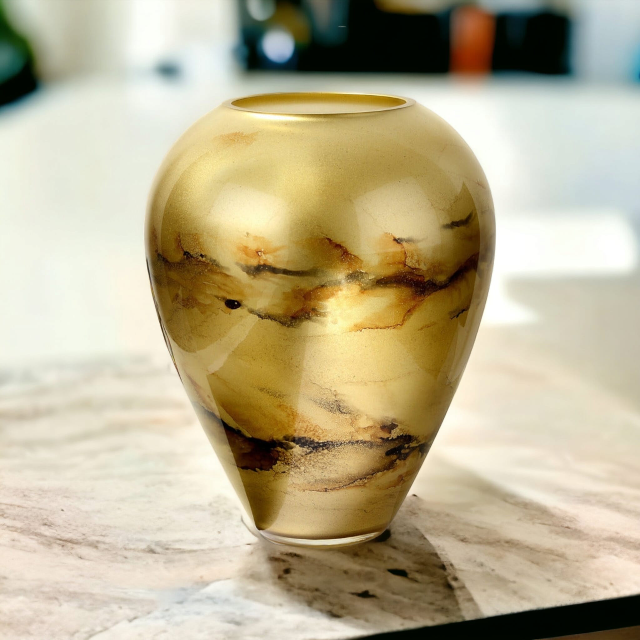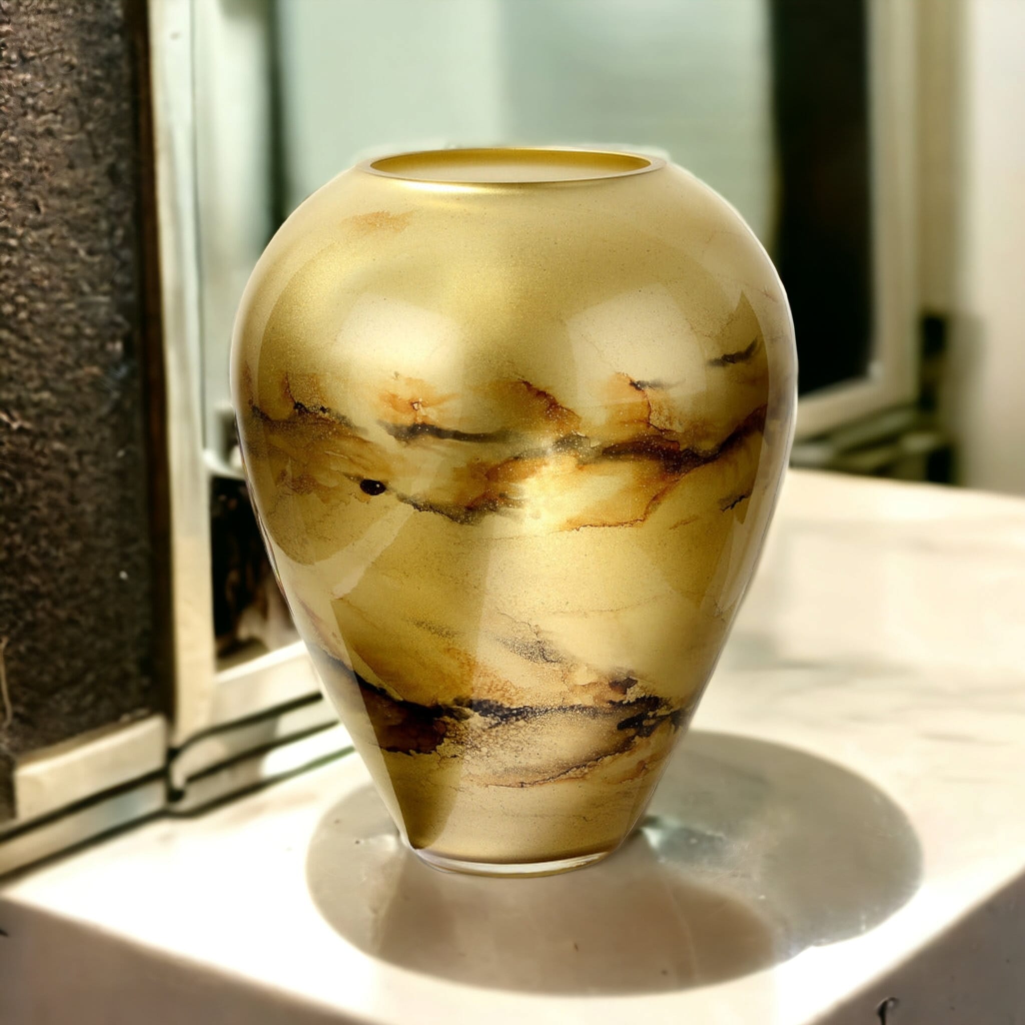 Szklany wazon marki VanderGroff – VG33/GOLD został wykonany z wysokiej jakości szkła i dekorowany ręcznie z niezwykłą precyzją. Złoty kolor w połączeniu z eleganckimi, ciemnymi marmurowymi wzorami nadają mu luksusowy charakter i elegancję. Idealnie sprawdzi się jako stylowy dodatek do wnętrz, wnosząc nutę klasy i prestiżu zarówno w nowoczesnych, jak i tradycyjnych aranżacjach.