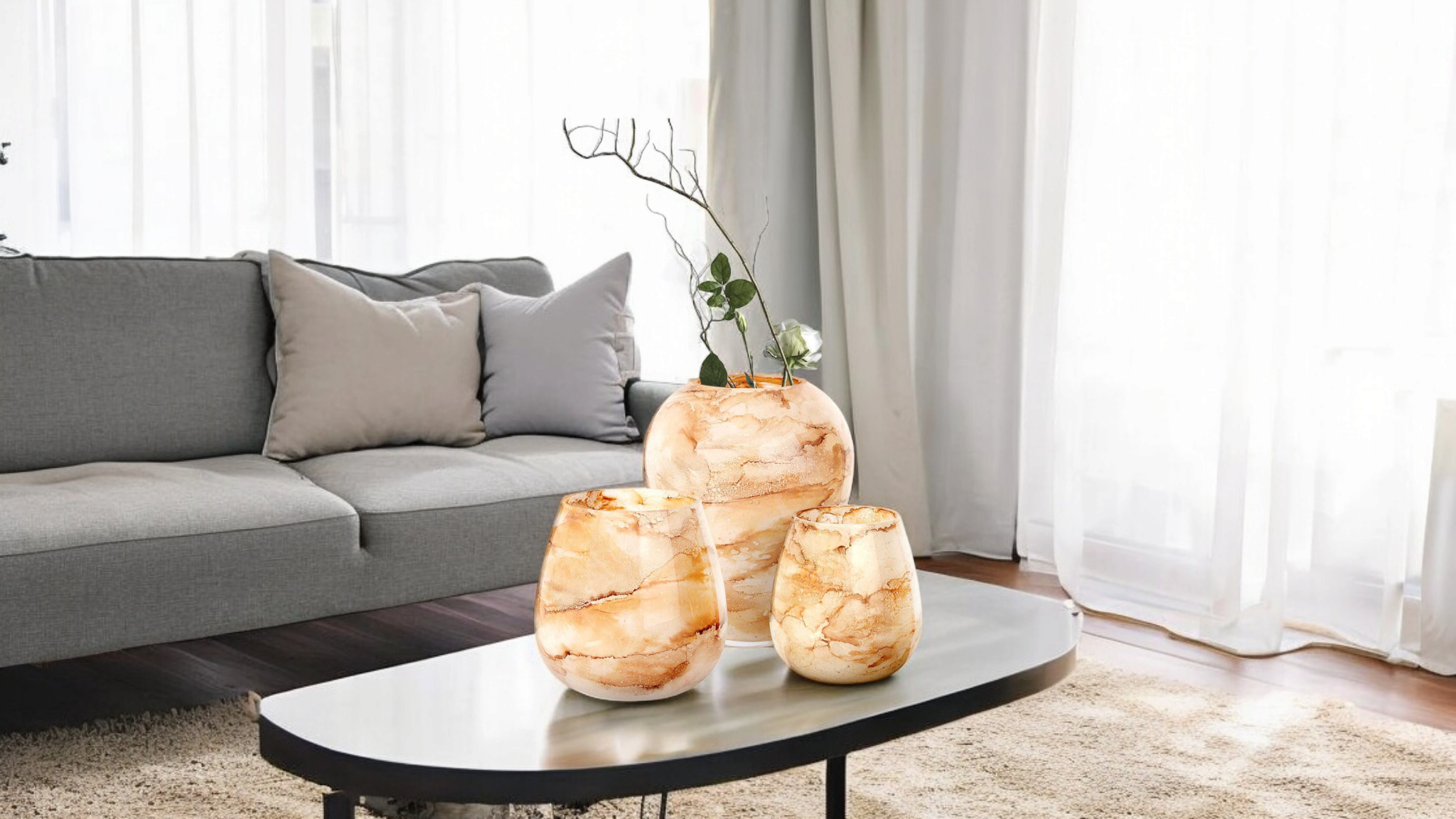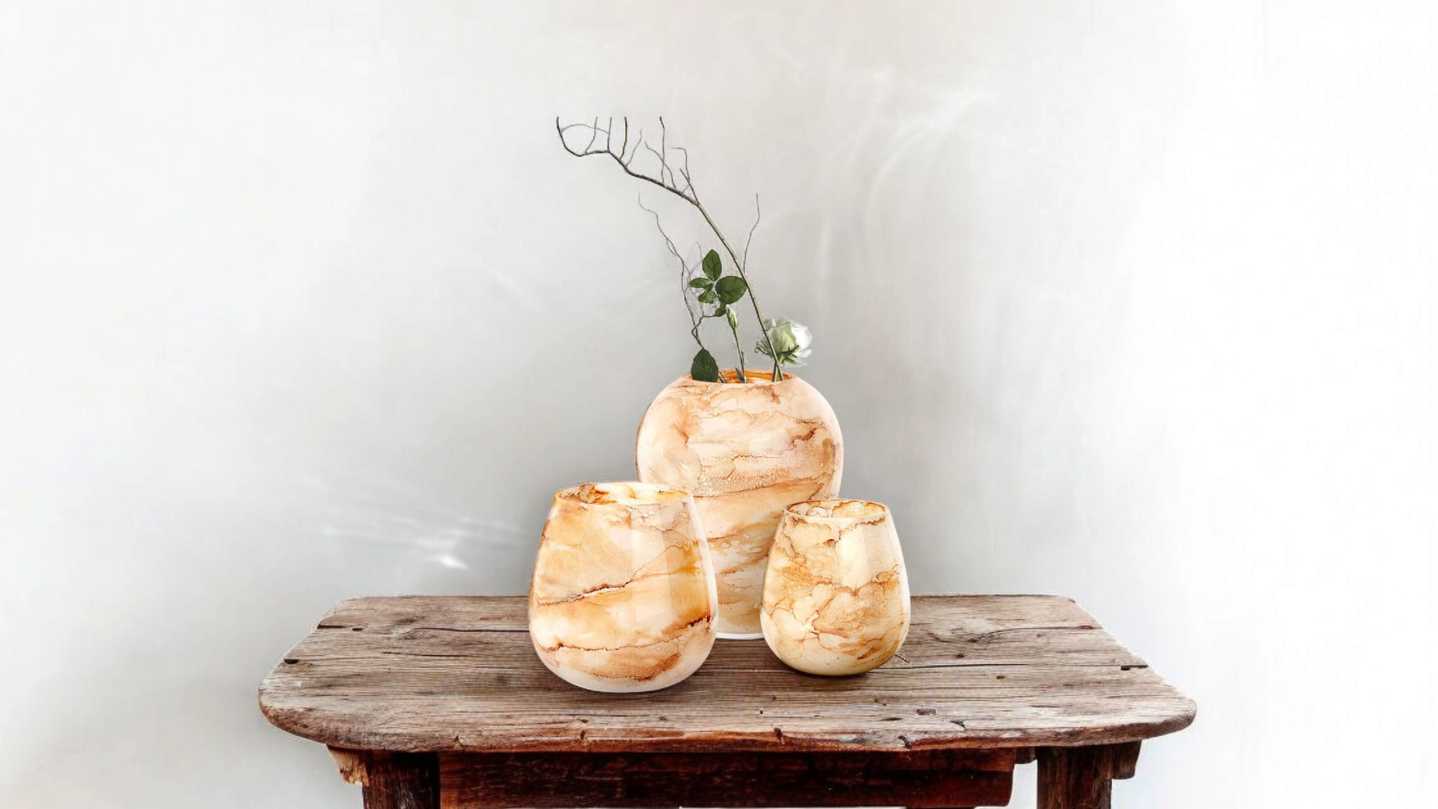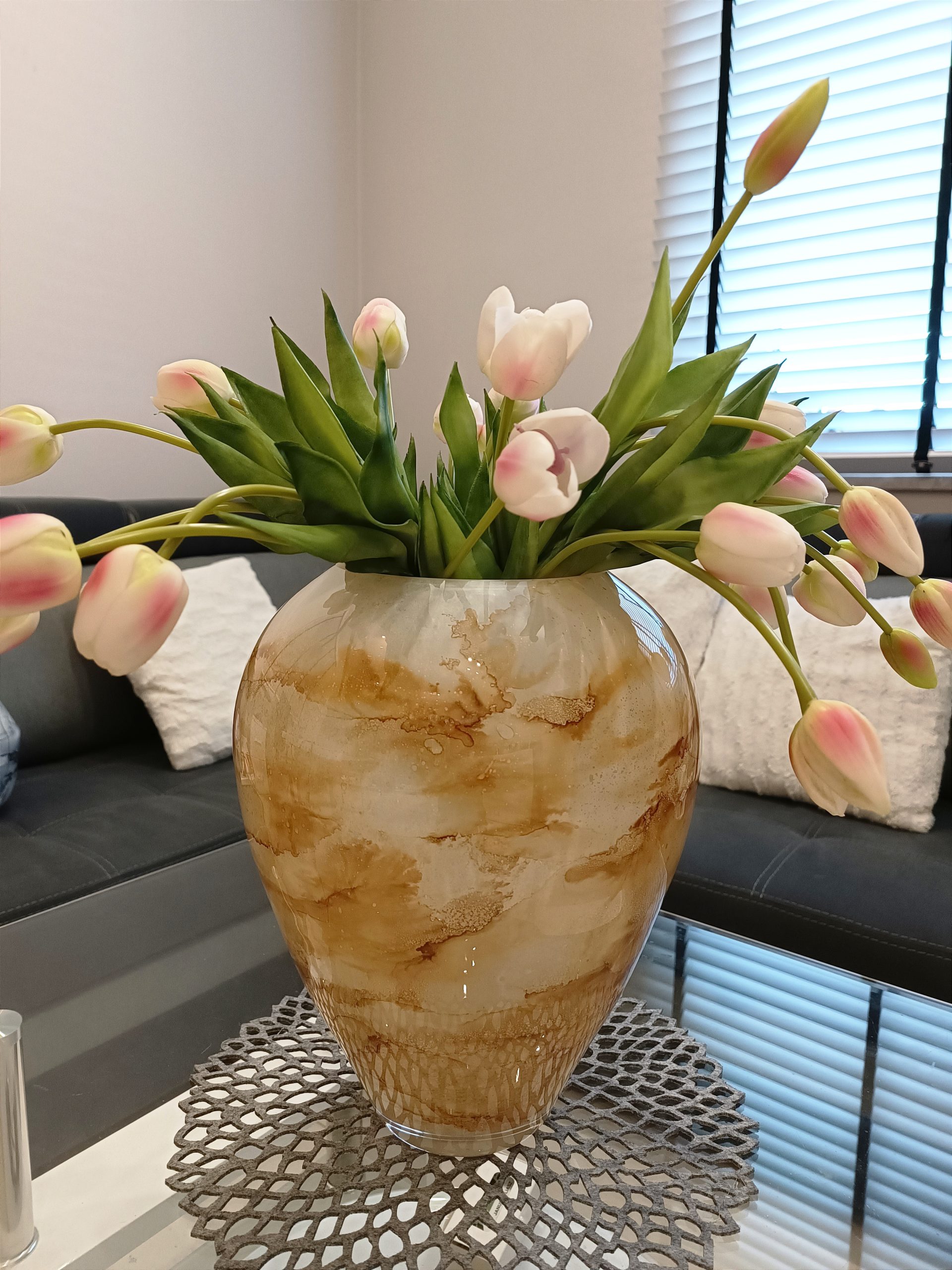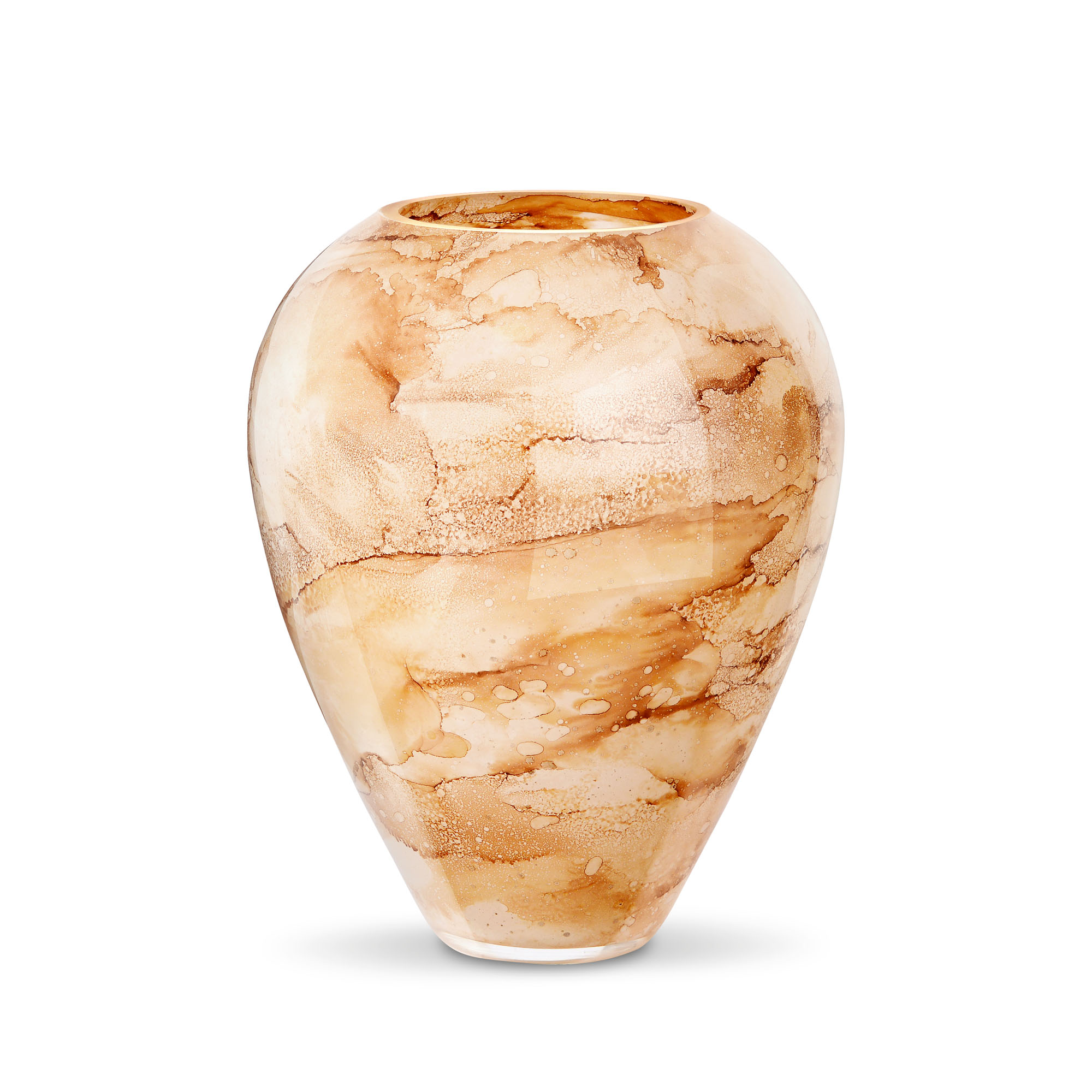 Szklany wazon marki VanderGroff – VG33/Touch of warmth to połączenie nowoczesnej elegancji i naturalnego uroku. Wykonany z wysokiej jakości szkła, charakteryzuje się ciepłymi, marmurkowymi odcieniami w tonacji beżowo-brązowej, które nadają mu unikalny wygląd i subtelną teksturę.