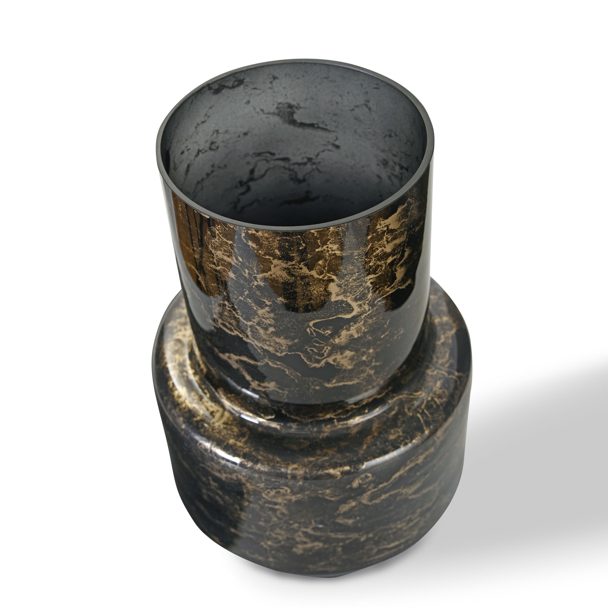 Szklany wazon marki VanderGroff – VG34/Black to wyjątkowa dekoracja, która łączy nowoczesny design z klasycznym luksusem. Wykonany z wysokiej jakości szkła, nadając wnętrzom elegancki i stylowy wygląd. Jego głęboki czarny kolor w połączeniu z subtelnym, złotym marmurowym wzorem tworzy niezwykle efektowną kompozycję, która przyciąga wzrok i stanowi elegancki akcent w każdym pomieszczeniu.