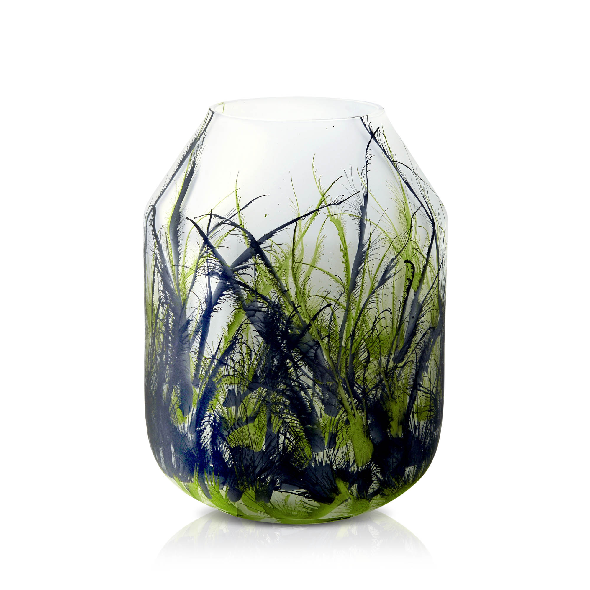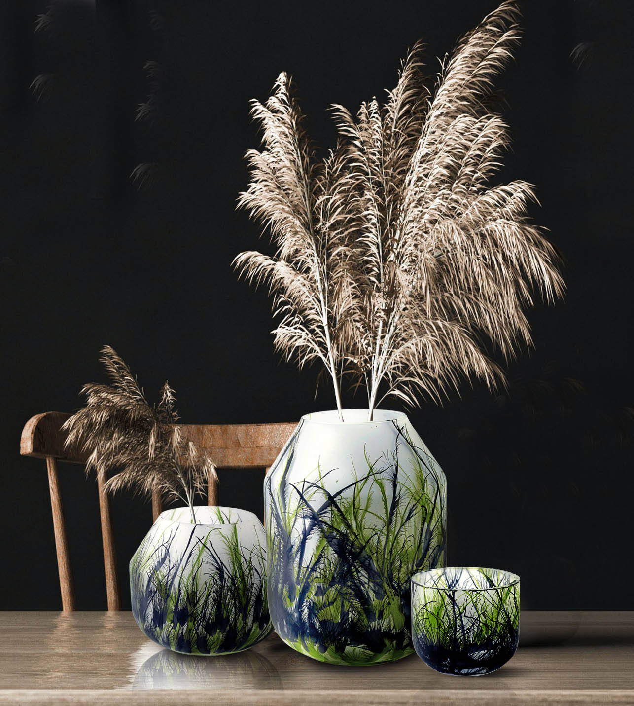 Szklany wazon marki VanderGroff – VG35/Natura został wykonany z wysokiej jakości szkła i zdobiony ręcznie, inspirowany brawami natury.  Jego wyjątkowo zielono-czarne zdobienie w połączeniu z jedwabistym matowym kolorem tworzy niezwykle efektowną kompozycję, która przyciąga wzrok i stanowi elegancki akcent w każdym pomieszczeniu.