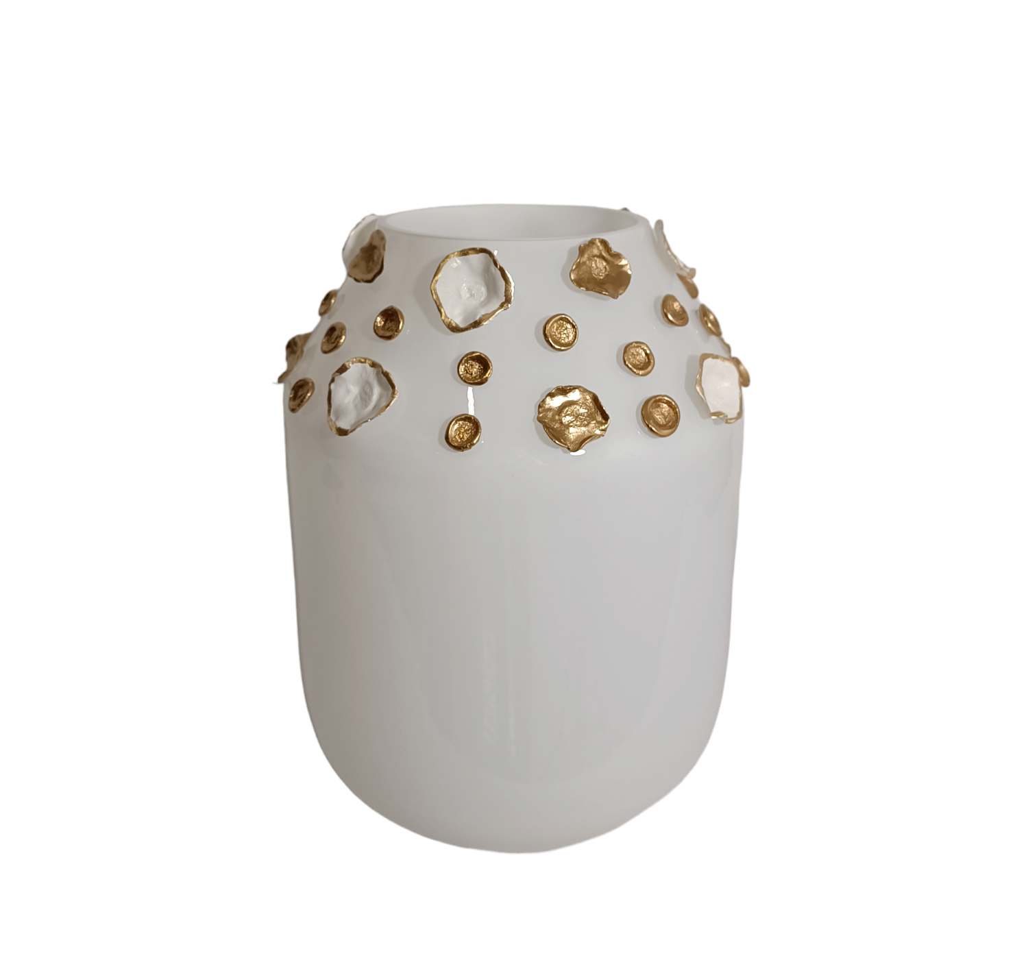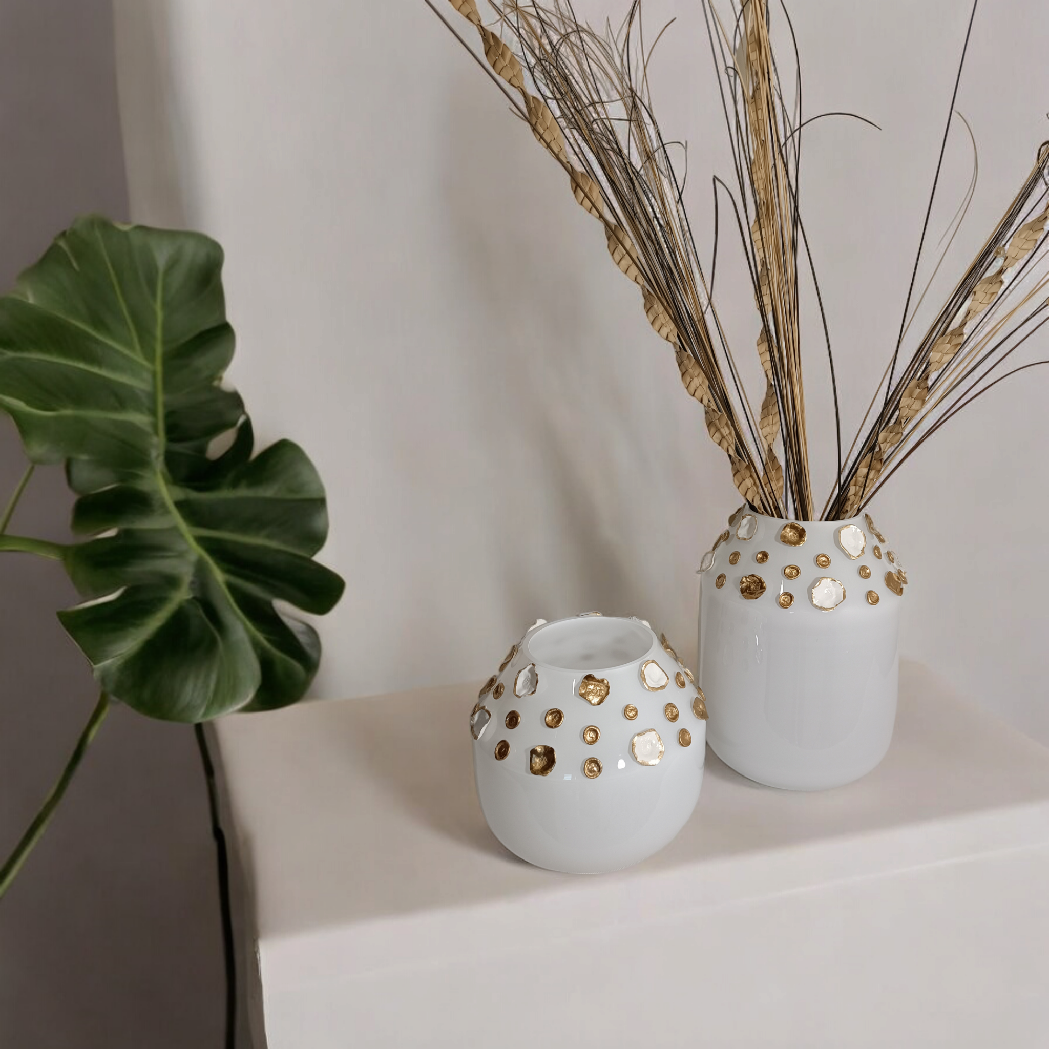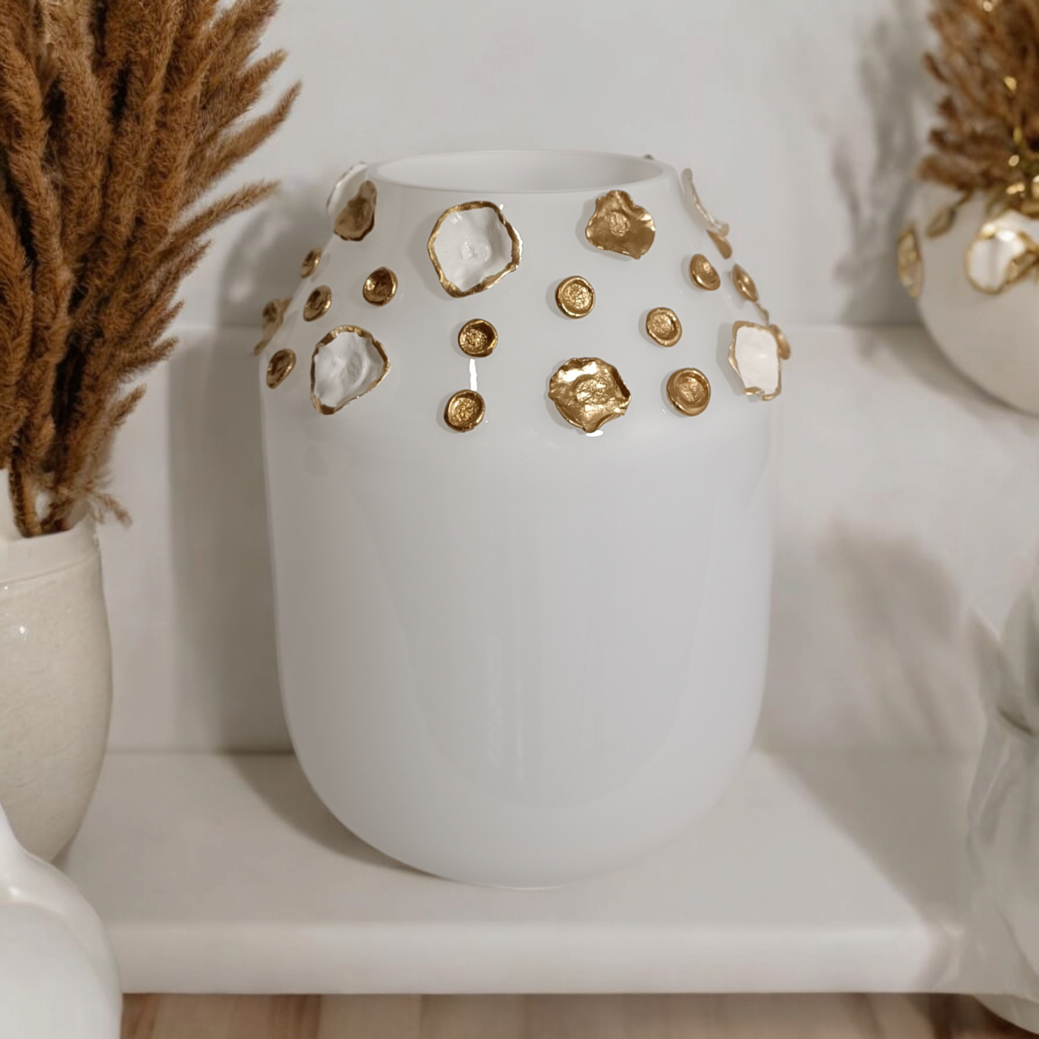 Szklany wazon marki VanderGroff – VG35W/DWG z serii Exclusive White to elegancki i stylowy dodatek, który doskonale uzupełni każde wnętrze. Jego bogaty biało-złoty design i perfekcyjne wykonanie podkreślają wyjątkowy charakter tej kolekcji.