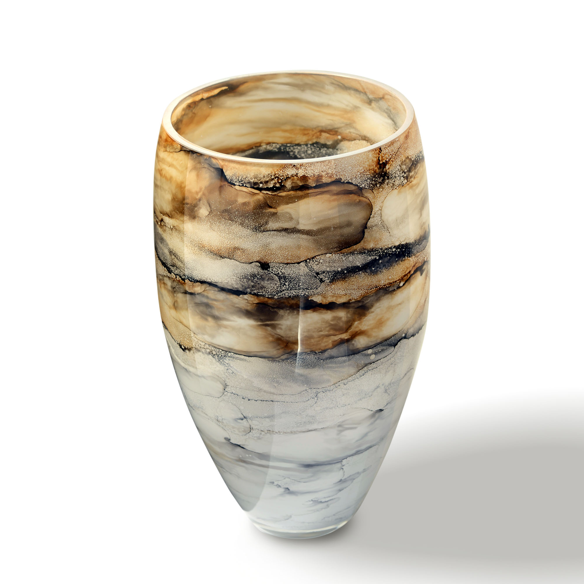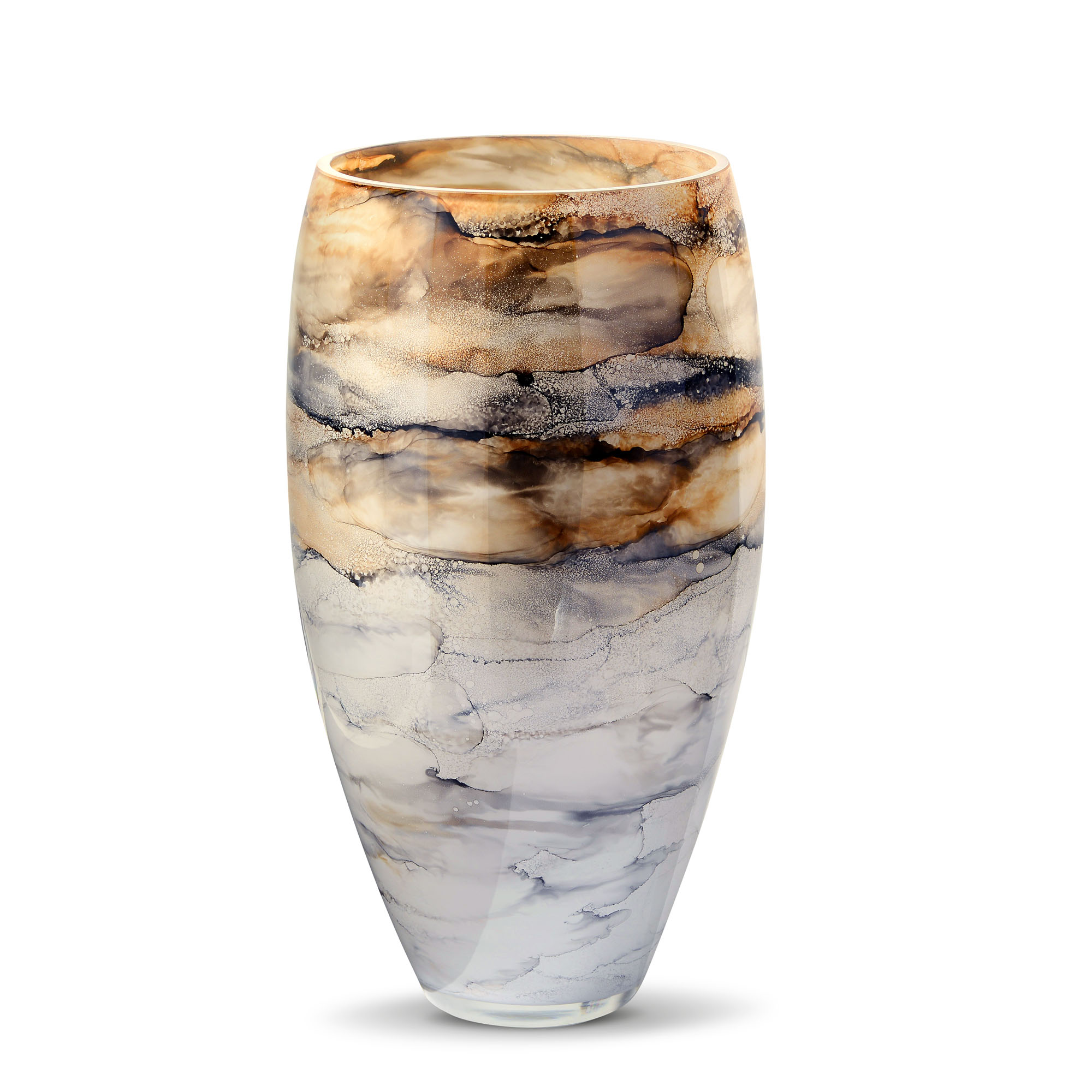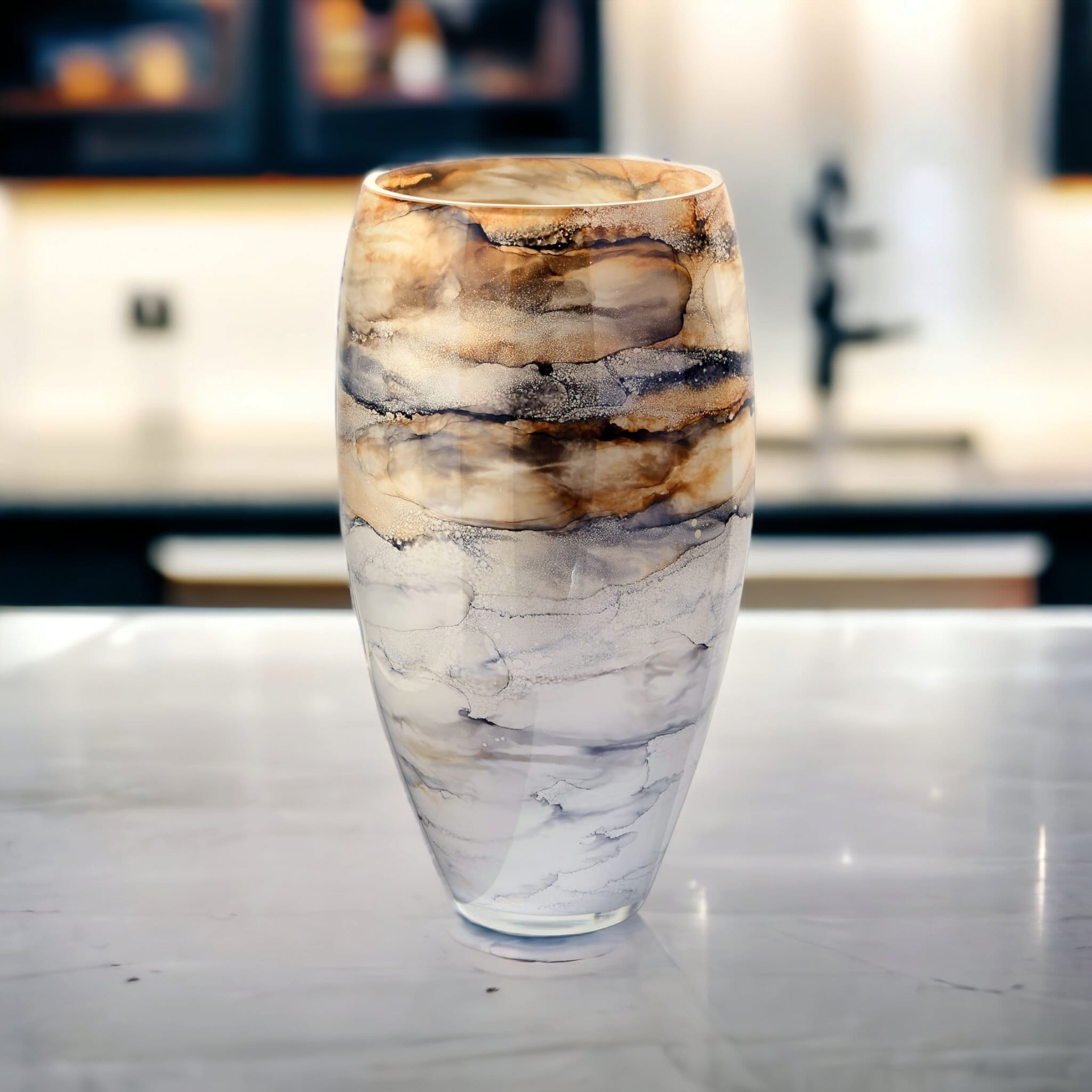 Szklany wazon marki VanderGroff – VG38/SAND charakteryzuje się eleganckim i artystycznym wyglądem, nawiązującym do naturalnych tekstur. Jego powierzchnia ozdobiona jest wzorem przypominającym marmur lub minerały, z harmonijnym przejściem kolorów od beżu, przez brąz, po odcienie niebiesko-szare. Kompozycja barw sprawia wrażenie płynności i głębi, dodając całości wyrafinowanego charakteru. Gładka, błyszcząca powierzchnia dopełnia całości, czyniąc go idealnym elementem dekoracyjnym do nowoczesnych i klasycznych wnętrz.