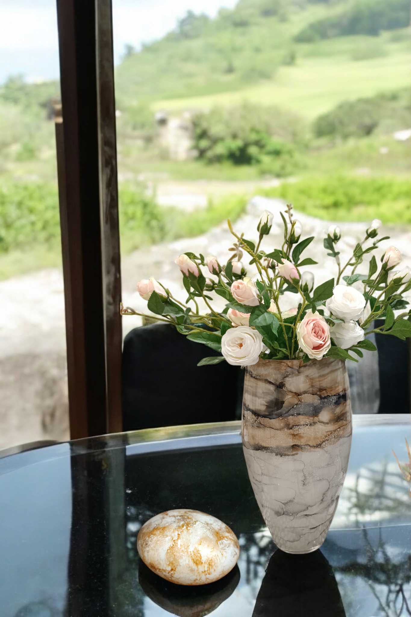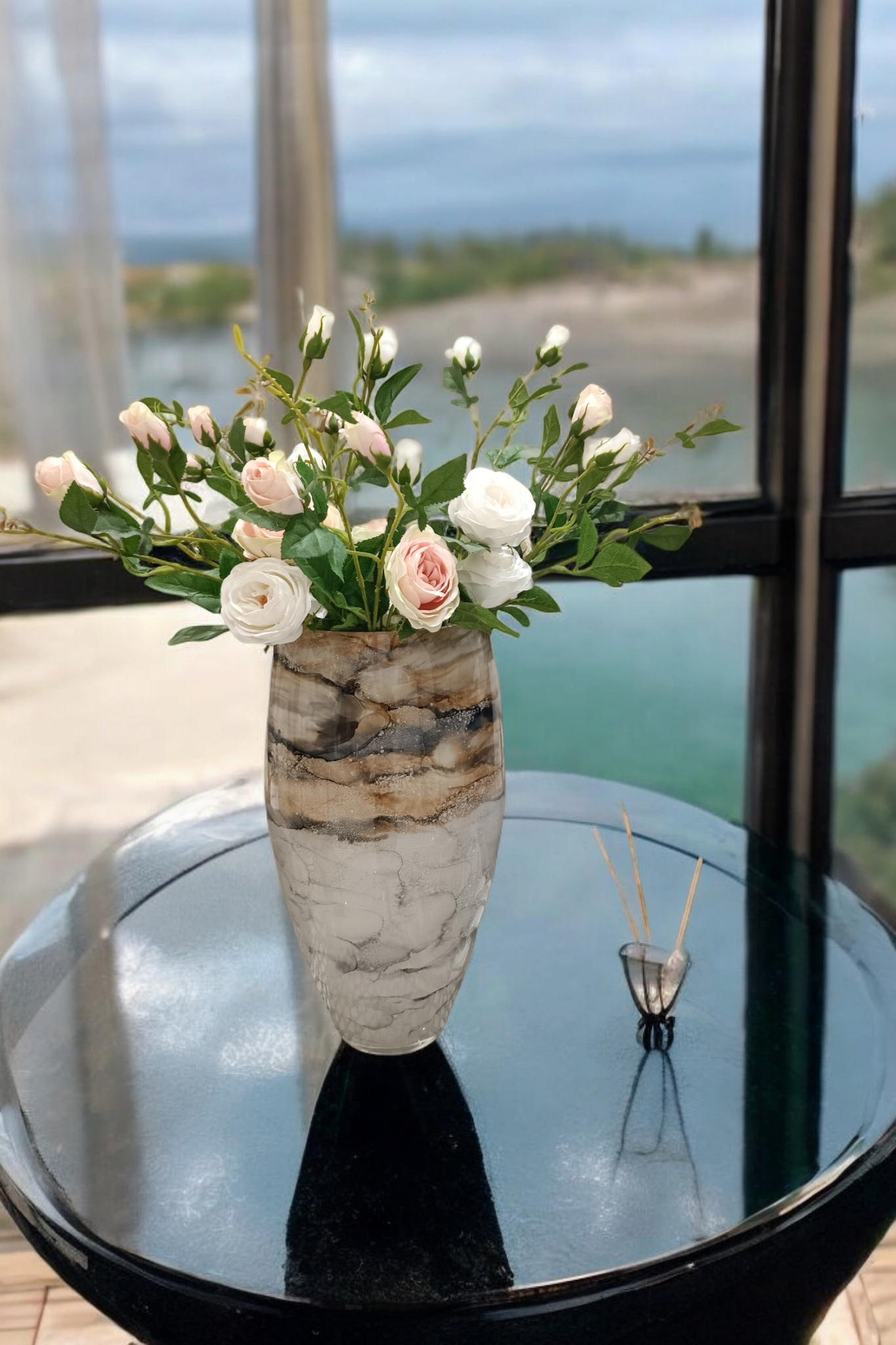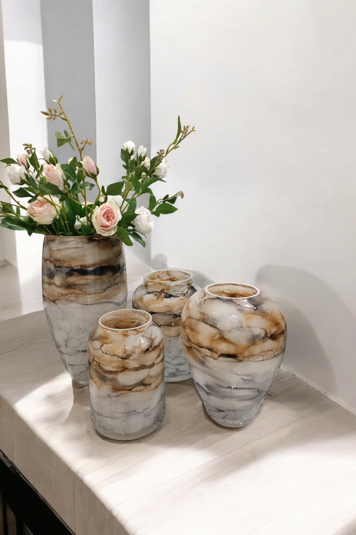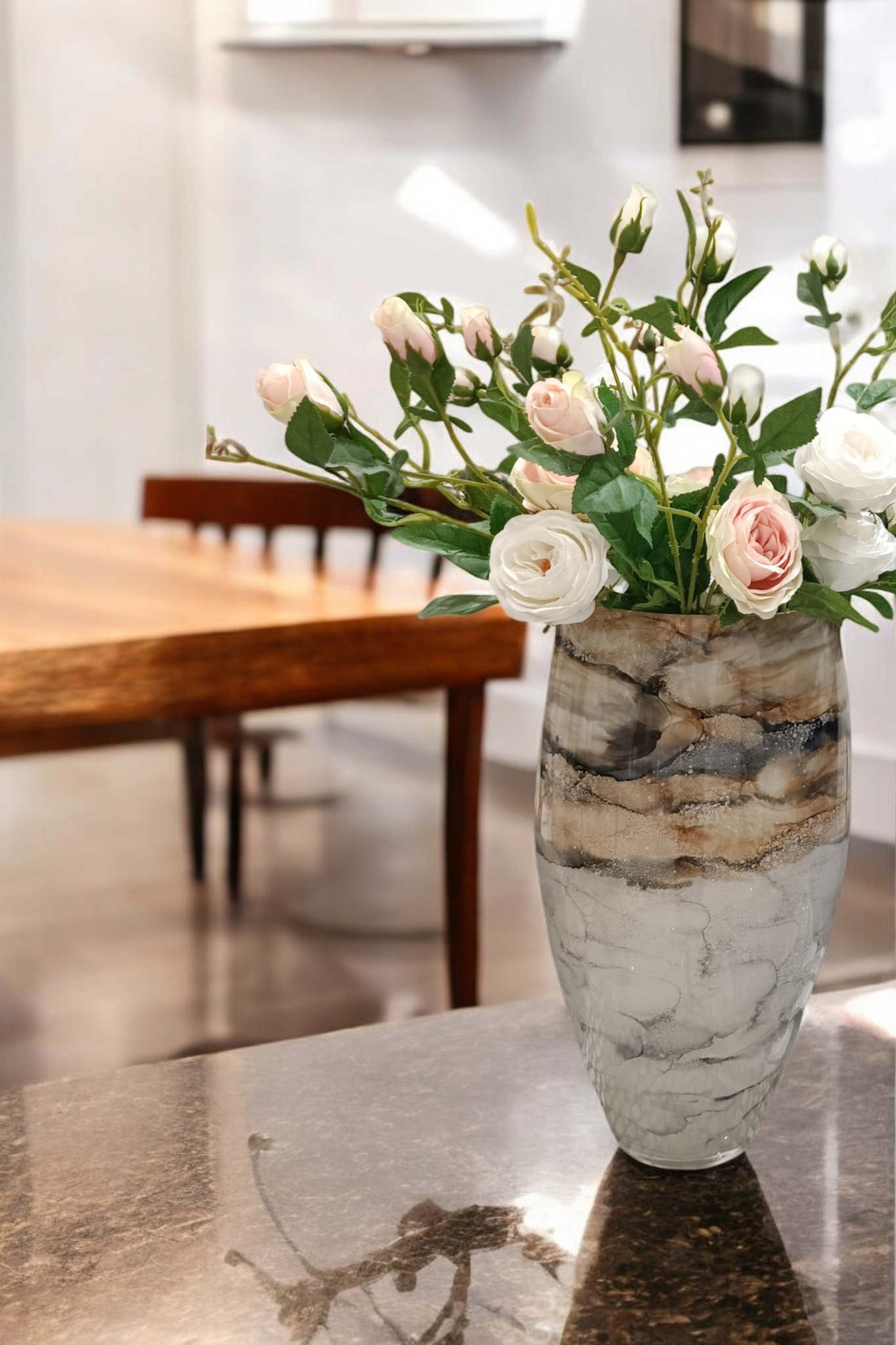 Szklany wazon marki VanderGroff – VG38/SAND charakteryzuje się eleganckim i artystycznym wyglądem, nawiązującym do naturalnych tekstur. Jego powierzchnia ozdobiona jest wzorem przypominającym marmur lub minerały, z harmonijnym przejściem kolorów od beżu, przez brąz, po odcienie niebiesko-szare. Kompozycja barw sprawia wrażenie płynności i głębi, dodając całości wyrafinowanego charakteru. Gładka, błyszcząca powierzchnia dopełnia całości, czyniąc go idealnym elementem dekoracyjnym do nowoczesnych i klasycznych wnętrz.
